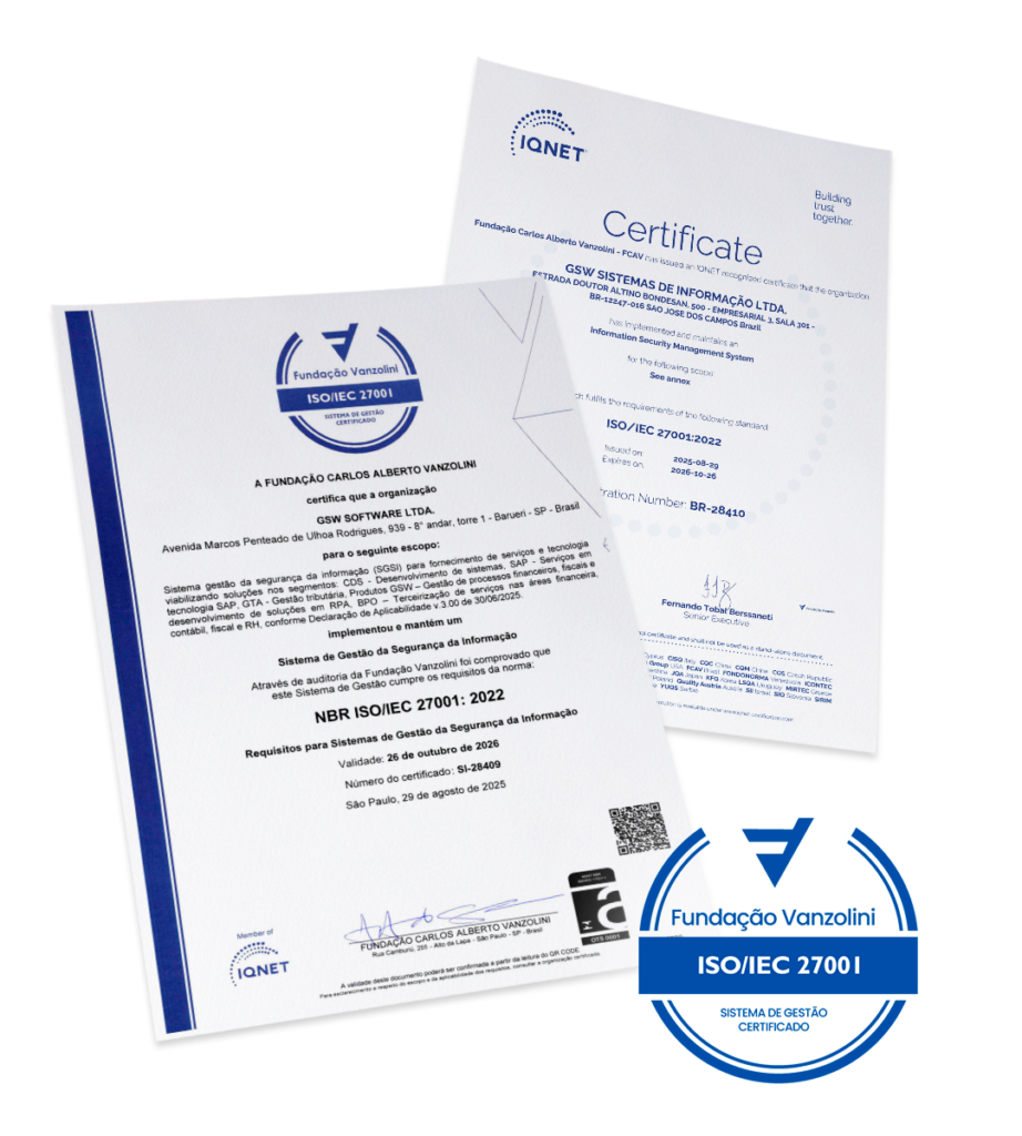 A GSW possui a certificação ISO 27001, o padrão internacional mais reconhecido para sistemas de gestão de segurança da informação (SGSI). Esta certificação demonstra nosso compromisso inabalável com a proteção dos dados de nossos clientes e a excelência em segurança da informação.