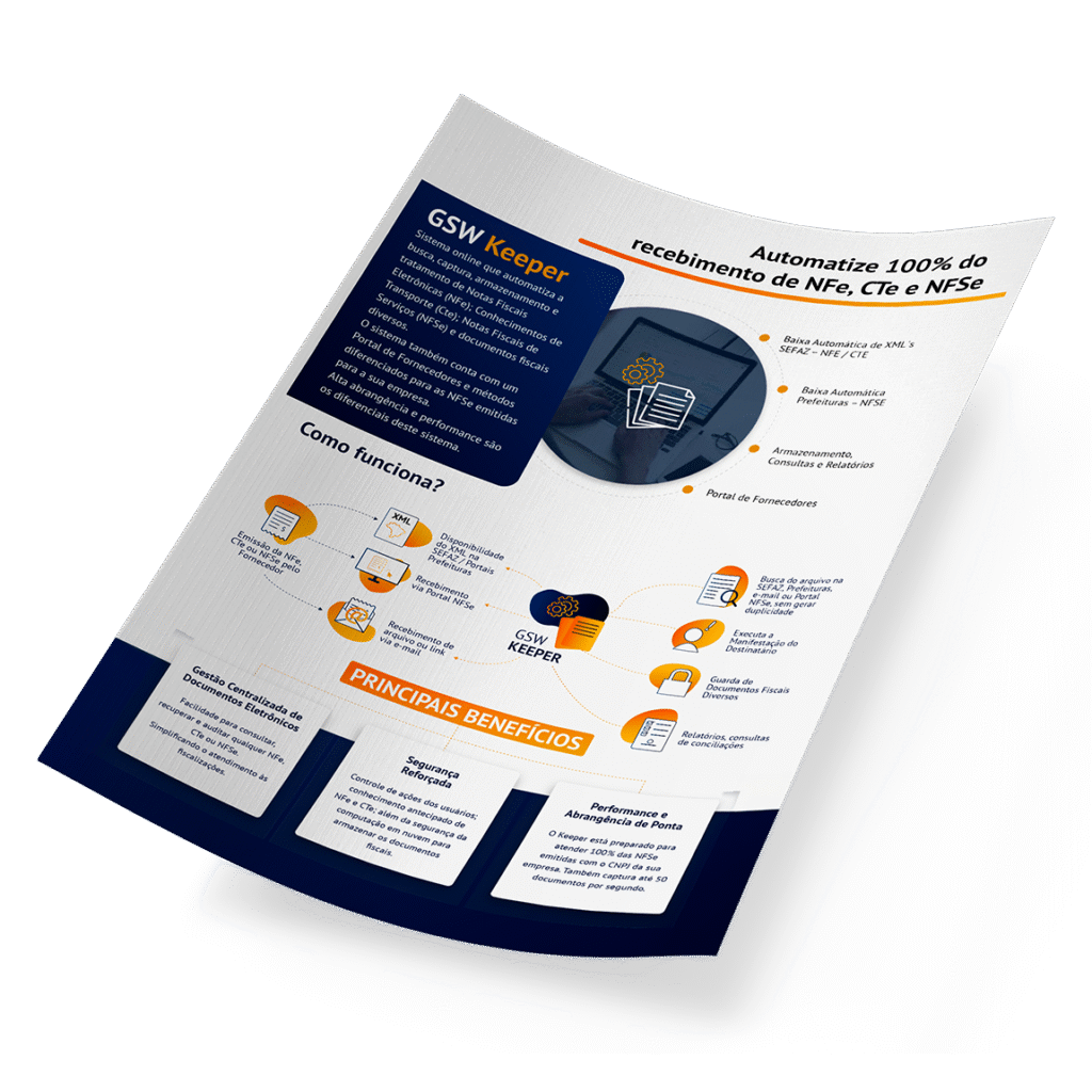 O GSW Keeper é um sistema online que automatiza a busca, captura, processamento e armazenamento de documentos fiscais eletrônicos, incluindo NFe, CTe, NFSe e diversos outros comprovantes como recibos, invoices e contas de consumo.