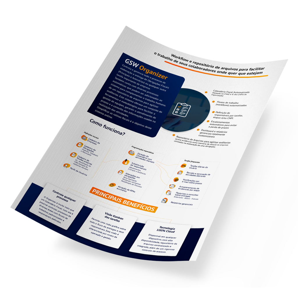 O GSW Organizer é um sistema online desenvolvido para controlar, organizar e monitorar todo o ciclo de entrega de obrigações fiscais, incluindo rotinas federais, estaduais e municipais, além de tarefas internas personalizadas de qualquer setor da empresa.